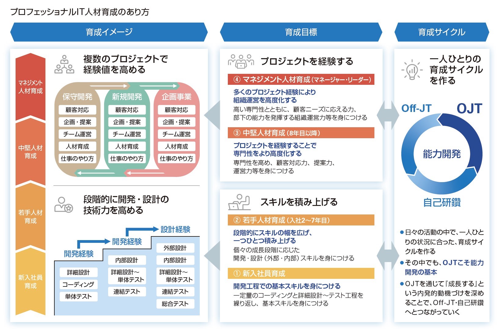 プロフェッショナルIT人材育成のあり方に基づき、若手のうちは年次ごとの「スキルの積み上げ」をベースに、中堅層以上ではさまざまなプロジェクトで経験・実績を積みながら、技術分野のハイエンドエンジニアとして段階的なスキルアップを図っていきます。一人ひとりの能力向上のため、成長・志向に合わせた体系的な支援プログラムを構築しています。