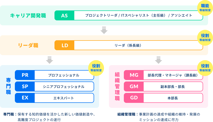 昇進昇格に年次や性別・国籍は関係ありません。社員の自主性を尊重し、自らの成長について意思表明する社員を積極的に支援していきます。やりたいことやキャリアなど、皆さんの意思を尊重する環境があり、スキルが伴っていれば、飛び級も可能です。
